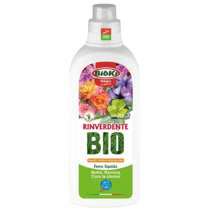 Il Rinverdente e' indicato per la prevenzione e la cura di ingiallimenti dovuti a carenza di ferro. Applicato con regolarita' permette una crescita rigogliosa, foglie verdi e intensamente colorate. E' indicato per tutte le piante ad elevato consumo di ferro, Piante ornamentali, Kiwi, Agrumi,Pero, Pesco, Vite, Siepi ed Orticole. Ideale anche per la colorazione delle Ortensie. Il prodotto realizzato con Formula Natural Booster, puo' essere impiegato fino al raccolto e impiegato nelle dosi e nelle modalita' applicative non e' dannoso per le api e gli insetti utili.DOSI E MODALITA' APPLICATIVE hhhh Diliure un tappo misurino pieno in 5 litri di acqua e ripetere ogni 7/8 giorni da Marzo ad Ottobre e 1 volta al mese da Novembre a Febbraio. Agitare prima dell'uso.